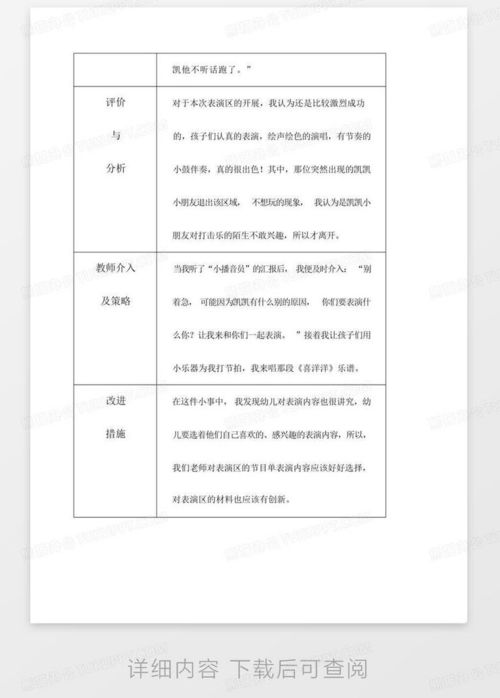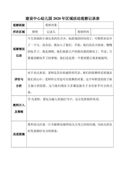 通过本次观察记录与分析,我们发现中班幼儿在区域游戏中的行为表现、认知发展以及社会交往能力都得到了较好的体现。为了进一步提高幼儿在区域游戏中的发展,我们提出以下建议: