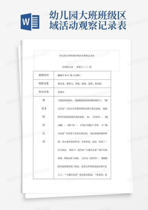 随着幼儿教育的发展,区域游戏作为一种重要的教学手段,在中班幼儿教育中扮演着越来越重要的角色。本文通过对中班幼儿区域游戏的观察记录与分析,旨在探讨幼儿在区域游戏中的行为表现、认知发展以及社会交往能力。