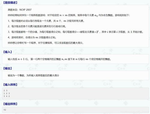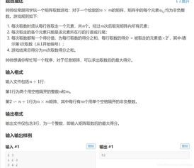 亲爱的读者们,你是否曾在某个午后,坐在窗边,想象自己是一名游戏高手,在虚拟的世界里挑战各种难题?今天,我要带你走进一个充满智慧与策略的世界——矩阵取数游戏。这个游戏不仅考验你的逻辑思维,还能让你体验到数学与策略的完美结合。准备好了吗?让我们一起揭开这个游戏的神秘面纱!